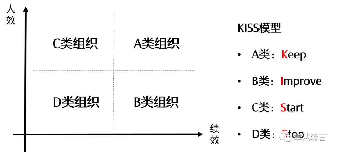这种算法的前提是组织有多业务,而且可以得到不同业务的各项人效指标。这里算法和标杆企业一样,只是这里的标杆企业成为了组织内的不同业务。并且,将不同业务的人效情况与业绩进行对比,从而对业务的不同发展方向进行差异化定位,可以参考以下KISS分类处理原则: