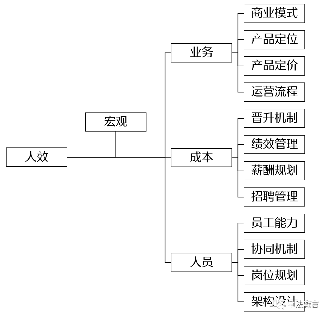 根据宏观人效的指标库的这些定义方式,如果整体人效状态低,或者几个指标发展趋势不理想,我们可以从以下”宏观人效树“来找到后续的组织干预的落脚点。