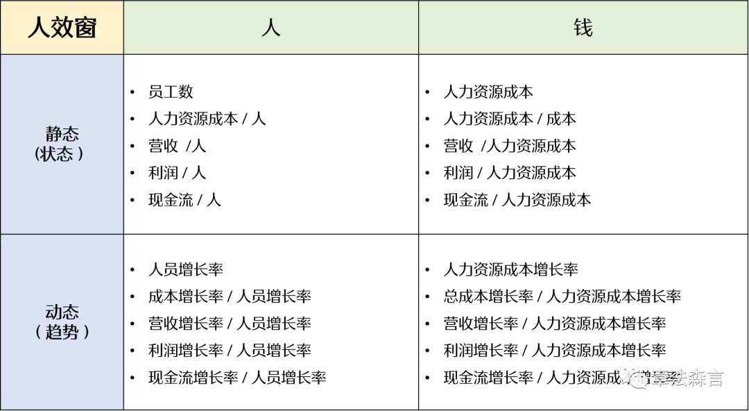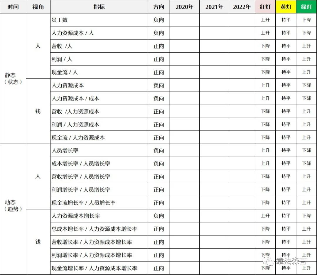 作为对于组织未来的分析,是要看的发展的“趋势”,所谓趋势的本质是看相对速度的差异(V1-V2 = 相对速度),比如人员的发展速度和营收的发展速度,就出现了上述描述种所提到的“不匹配”。这样就形成了动态人效(宏观)分析的10个指标,即将人员增长率与人力资源成本增长率与现金流、利润、营收以及成本四个变量的增长率进行对比,看到一个阶段下多个指标的趋势变化。趋势的平衡才是一种组织人效的宏观健康。