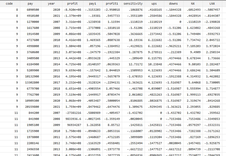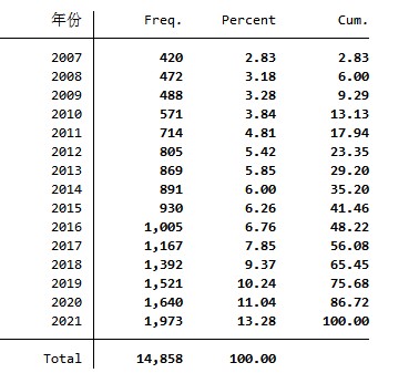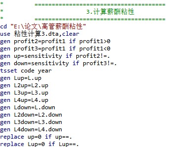 数据编码如下,以前大多都是2006——2021十几年的高管薪酬,一年一个文件,非常麻烦,经过我的编写,可以一个do文档就实现十几年的高管薪酬粘性在一个表格里展现。