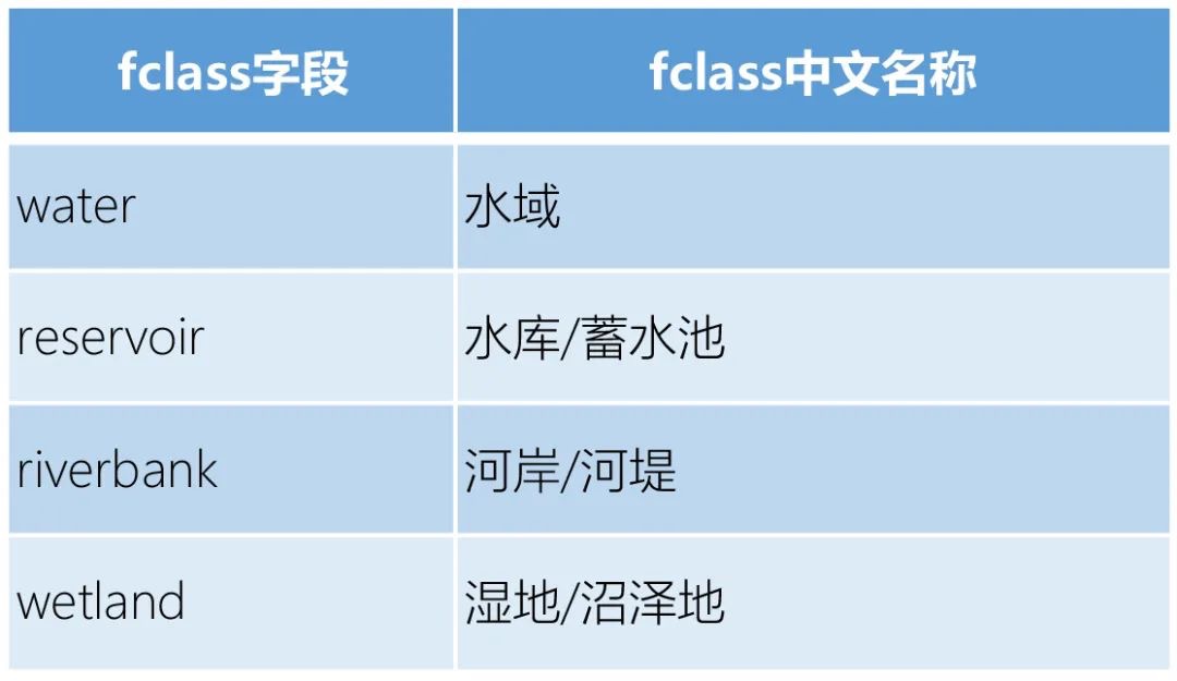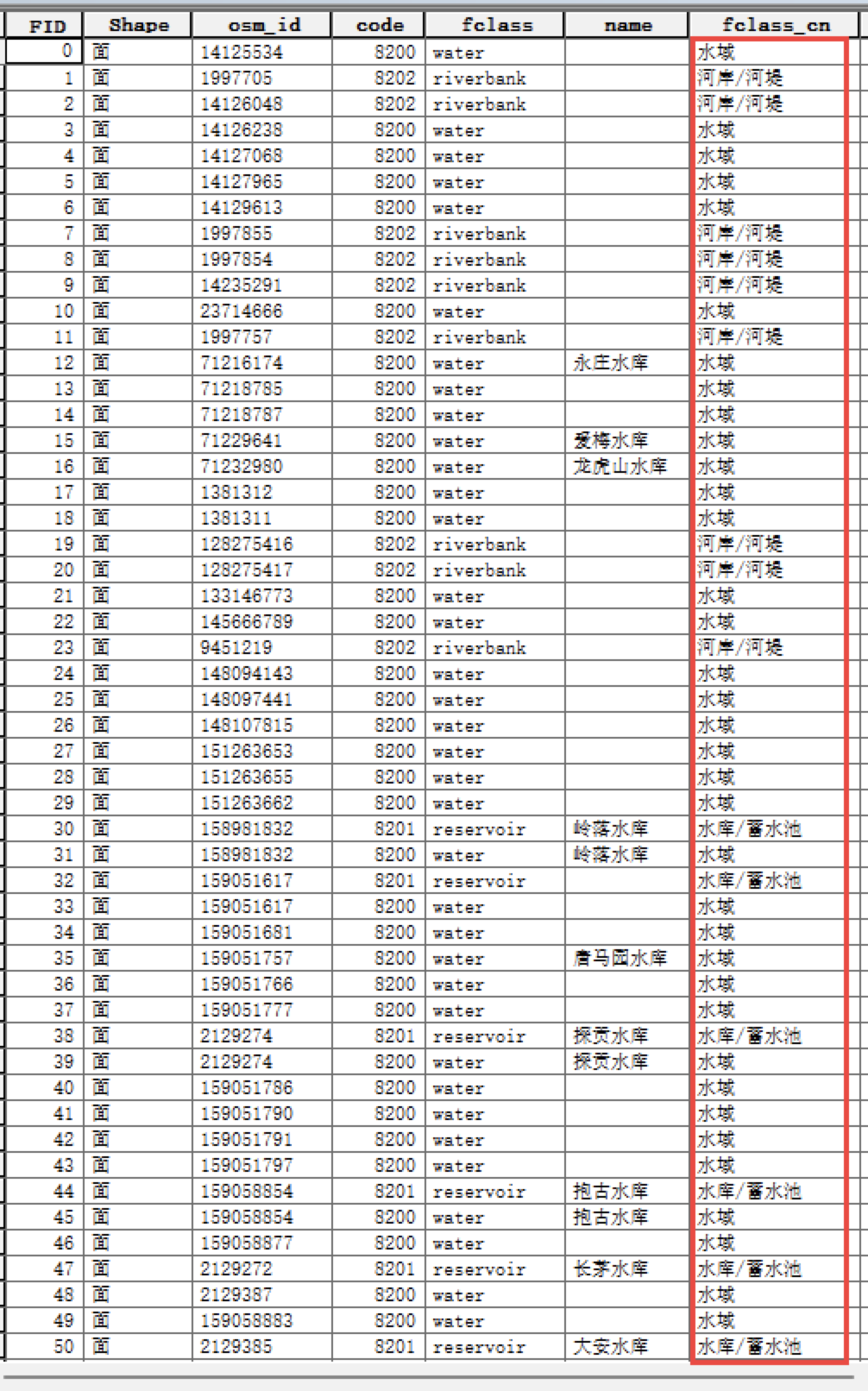 水系面图层,主要是面状水体,比如水库、湖泊等,具体包括下表所示的类型,水系类型是存储在数据属性表的“fclass"这个字段里面: