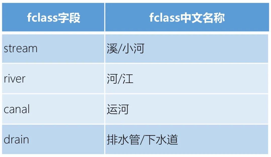 水系线图层,主要是线状水体,包括小河、小溪等,具体包括下表所示的类型,水系类型是存储在数据属性表的“fclass"这个字段里面: