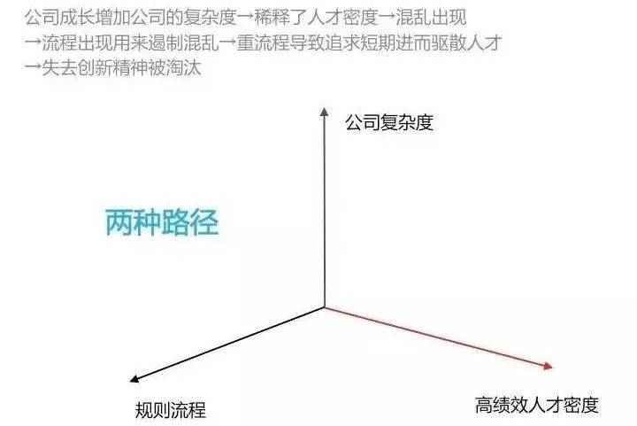 所以用一幅图来回答这个问题。竖轴是业务复杂度,代表你公司的业务的多样性,公司业务之间需要配合的程度;红线这条是人才的密度,优秀人才的密度;左下角黑线是流程规则。