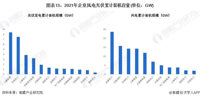 中国发电市场呈“五大四小”纵横之势。随着近年来国家对能源结构的调整与把控,头部企业在向清洁能源加速扩张业务版图的同时,通过一系列兼并重组,形成了新的竞争格局。2021年,作为清洁能源开发的领头羊,“五大四小”所属上市公司表现亮眼:据不完全统计,在风电板块,国家能源投资集团下属的龙源电力2021年风电累计装机容量为23.67GW,位列第一,其次是华能国际、华润电力、三峡能源和大唐新能源,累计装机规模超过10GW;在光电领域,三峡能源以8.41GW的累计装机规模位列第一,其次是国家电力投资集团下属中国电力,光伏发电累计装机规模为7.49GW。