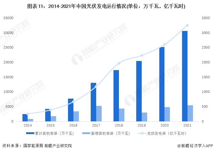 从发电情况看,2021年,全国光伏发电量3259亿千瓦时,同比增长25.1%。