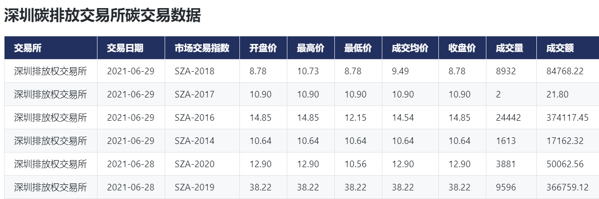 在2011年10月以来,中国陆续建设了7家主要的碳排放交易所:广州碳排放权交易所、深圳排放权交易所、北京环境交易所、上海环境能源交易所、湖北碳排放权交易所、天津排放权交易所和重庆碳排放权交易所,本数据除囊括以上地区交易所的数据以外,还另外收录了四川联合环境交易所碳交易平台的数据。