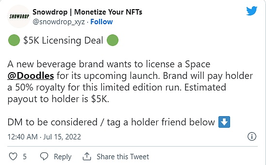 与此同时,NFT授权初创公司Snowdrop正在创建一个时事通讯和品牌服务,将NFT持有者与希望将其艺术品用于保湿剂和饮料等产品的公司联系起来。