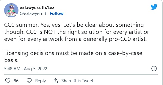 但并非所有人都认为CC0的缺点使其无用。许多人认为,公开分享艺术品符合艺术的真正精神,因为没有任何限制或约束阻止它自由分享。有些人,如CC0投资分散式自治组织(DAO)C0C0的成员,认为支持CC0生态系统是因为他们培养了一种开源信息共享的文化,有些人认为这是Web3精神的核心。