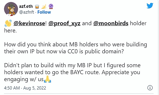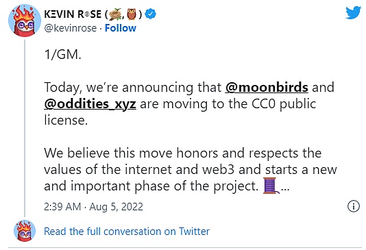 毋庸置疑,并非所有NFT持有者都感到高兴。一些人抱怨说,一旦Moonbirds宣布切换到CC0,他们不得不退出许可协议,因为他们不再拥有许可艺术品的专有权。