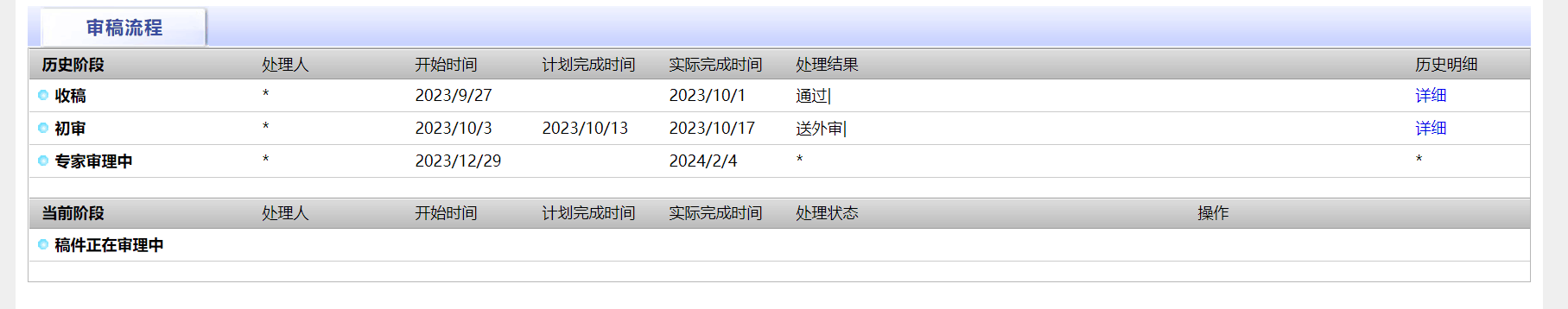 shamingzia 发表于 2024-2-4 20:30 您好,我送第二次外审的时候,本来下面显示专家审理中,今天忽然变成稿件正在审理中,但是上面仍然只有一 ...