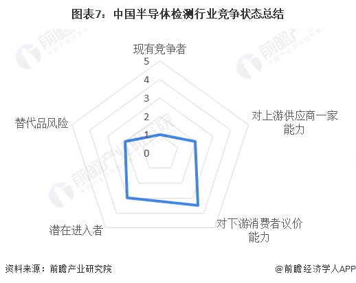 从五力竞争模型角度分析,目前,我国半导体检测行业属于新兴检测服务行业,替代品威胁小;现有竞争者数量不多;上游供应商检测技术人员、设备等企业议价能力较强;而随着半导体产能发展,以及下游应用领域对于集成电路等产品性能要求的提升,半导体检测市场需求空间正在逐步扩大,下游议价能力正在逐渐增强;同时,因行业存在严格的准入资质以及资金、技术门槛较高,潜在进入者威胁较小。根据以上分析,对各方面的竞争情况进行量化,5代表最大,0代表最小,目前中国半导体检测行业五力竞争总结如下: