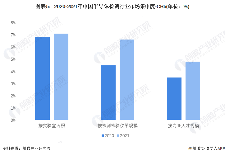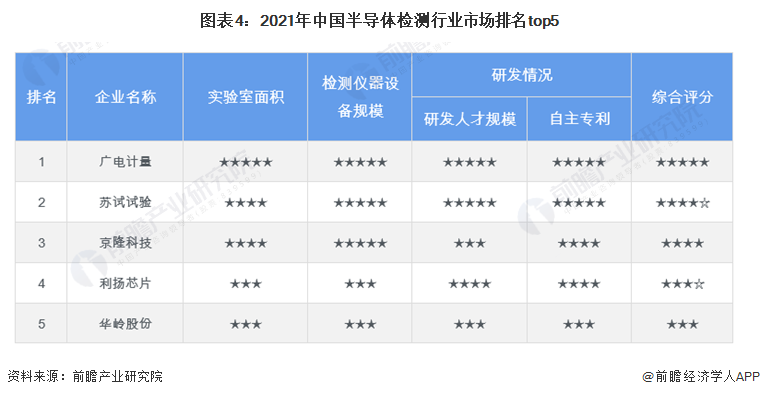 现阶段中国半导体检测行业龙头企业包括中国赛宝、京隆科技、广电计量等,前瞻根据实验室面积、企业公布检测仪器设备规模、企业研发人才规模、企业自主专利等半导体检测机构关键指标计算得出业内企业top5排名情况如下: