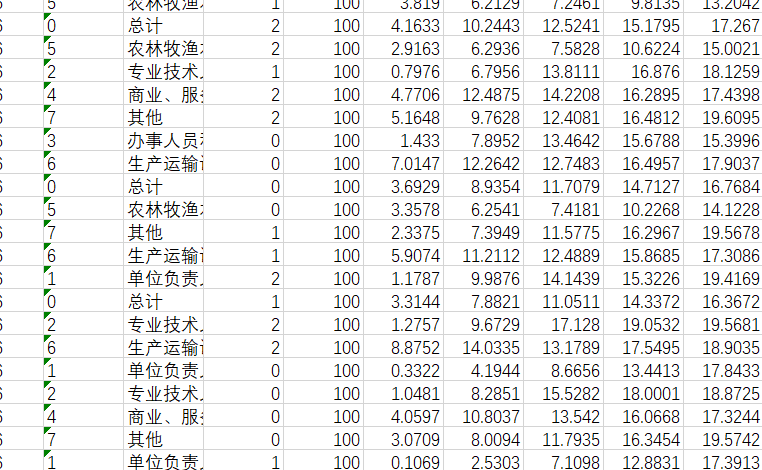 | [职业编码] | 0=总计;1=单位负责人;2=专业技术人员;3=办事人员和有关人员;4=商业、服务业人员;5=农林牧渔水利业生产人员;6=生产运输设备操作人员及有关人员;7=其他; |