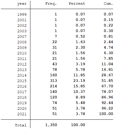 样本选择:全部A股1998-2021年数据(“交易信息总表1995-2021”在数据库中是从1995-02-21开始,经过处理后的数据起点为1999年)