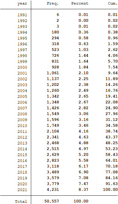 样本选择:全部A股1990-2021年数据(初始数据是从1990年开始,经过处理后的数据起点为1991年)