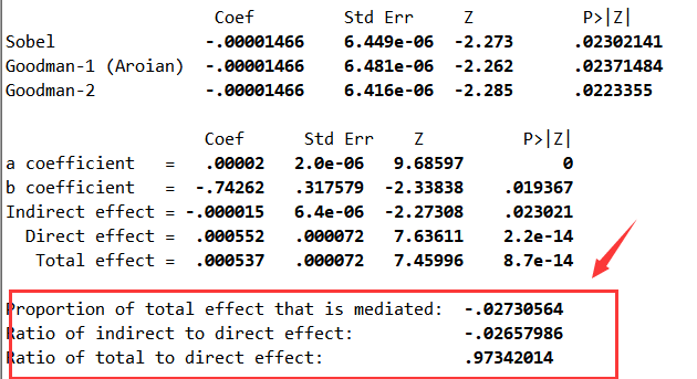 求助:sobel检验中介效应,Proportion of total effect that is mediated为负数?