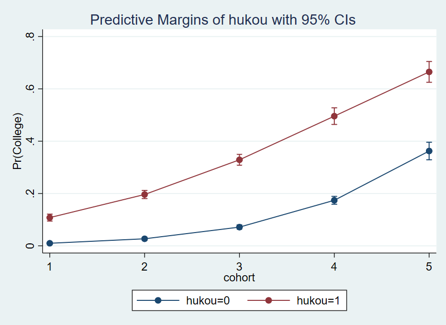 reg college i.sex ISEI i.hukou##c.cohort