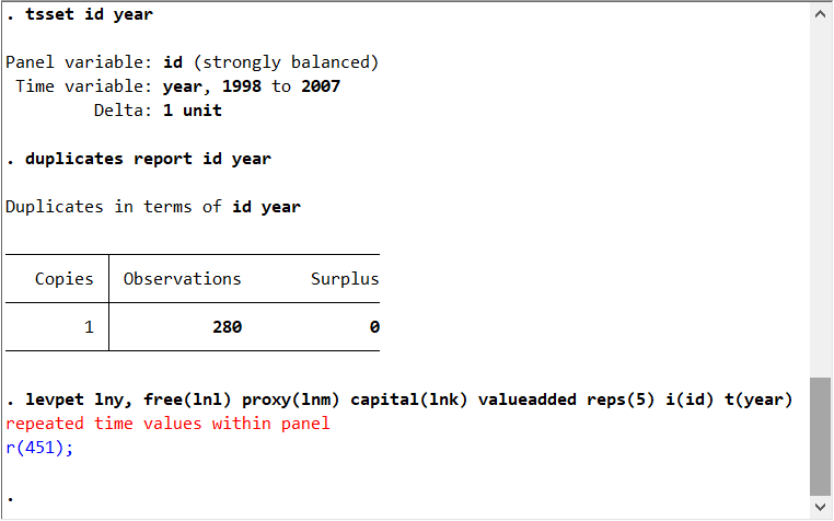 已经是强平衡面板数据,但在运行levpet时仍提示repeated time values within panel