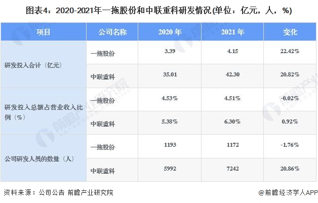 由于中联重科的业务范围涉及工程机械、农业机械等,因此研发投入高于以农业机械为主的一拖股份。从研发投入变化看,2021年两家公司的研发投入均增加。从研发人员数量看,2021年一拖股份出现下降,但是中联重科研发人员增加。