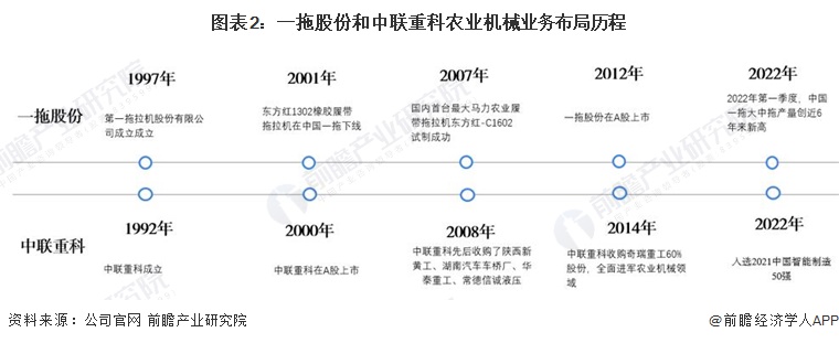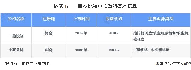 一拖股份前身是第一拖拉机制造厂,始建于1955年,主要经营拖拉机等农机产品。2012年公司在A股上市。中联重科成立于1992年,是一家经营工程机械、农业机械等技术装备的企业,2000年在A股上市,2010年在H股上市。