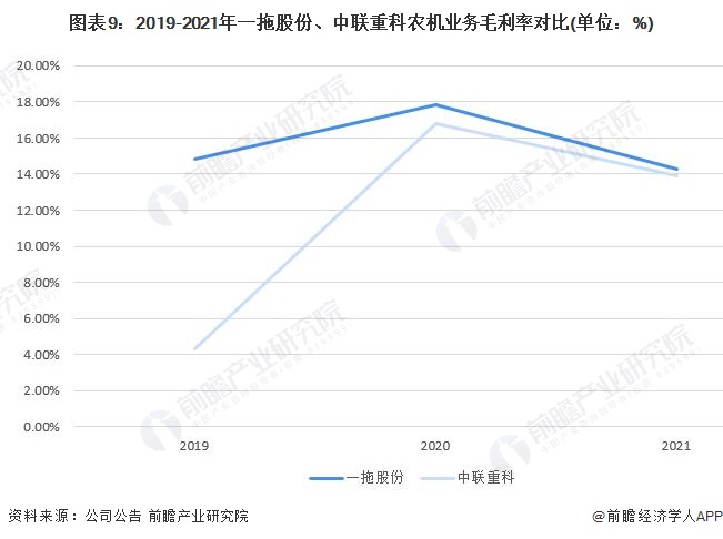 从农机业务毛利率看,2019-2021年一拖股份和中联重科均呈现先上升后下降趋势,2021年分别达到14.28%和13.92。一拖股份的农机业务毛利率始终高于中联重科。