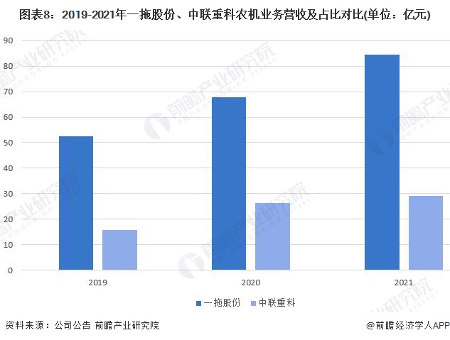 从农机营收趋势看,2019-2021年一拖股份和中联重科的农机业务营收均呈现上升趋势。从农机业务规模看,一拖股份的农机业务营收远超中联重科,2021年一拖股份农机业务营收为84.62亿元,而中联重科则为29.07亿元。