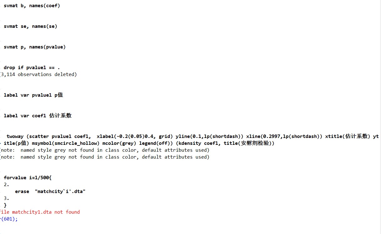 twoway (scatter pvalue1 coef1, xlabel(-0.2(0.05)0.4, grid) yline(0.1,lp(shortdash)) xline(0.2997,lp(shortdash)) xtitle(估计系数) ytitle(p值) msymbol(smcircle_hollow) mcolor(grey) legend(off)) (kdensity coef1, title(安慰剂检验))
