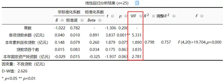 如果说自变量X已经对因变量Y产生显著影响(P<0.05),还想对比影响大小,建议可使用标准化系数值的大小对比影响大小,上图所示,显著的自变量中,各项贷款余额、本年累积应收贷款、贷款项目个数的标准化系数分别为0.264、0.220、0.157。所以各项贷款余额标准化系数最大,进而看出模型中各项贷款余额对不良贷款影响较大。