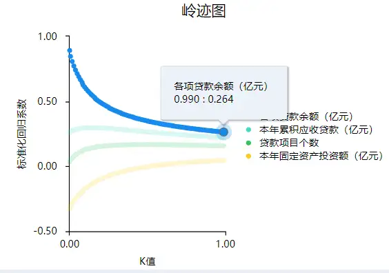 图中可以看到,当K值为0.99时,此时自变量的标准化回归系数趋于稳定,因而SPSSAU建议设置最佳K值取为0.99。
