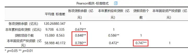 各项贷款余额、本年累积应收贷款、贷款项目个数三个自变量p值均小于0.05,具有显著性差异,而本年固定资产投资额p值为0.418大于0.05,不具有统计学意义。