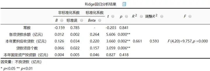 本案例中K值取0.99,返回分析界面,输入K值,得出岭回归模型估计。输出结果如下: