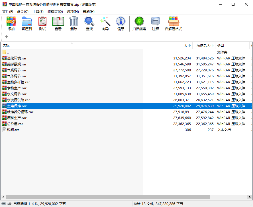 中国陆地生态系统服务价值空间分布数据集2015:食物原料生产水资源供给净化环境气体水文调节土壤保持维持养分循环生物多样性美学景观