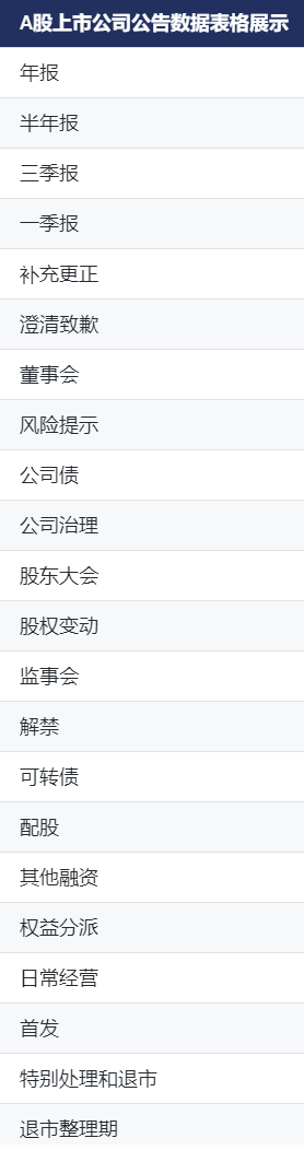 A股上市公司全部公告数据时间范围为2000年至2021年,共涵盖年报、半年报、三季报、公司治理、股东大会、日常经营等29个类型公告,囊括股票代码、公司名称、公告标题、公告时间、分类、行业、年度等字段,信息量极全,对A股上市公司研究、证券市场研究等方面起到有力的数据支撑。