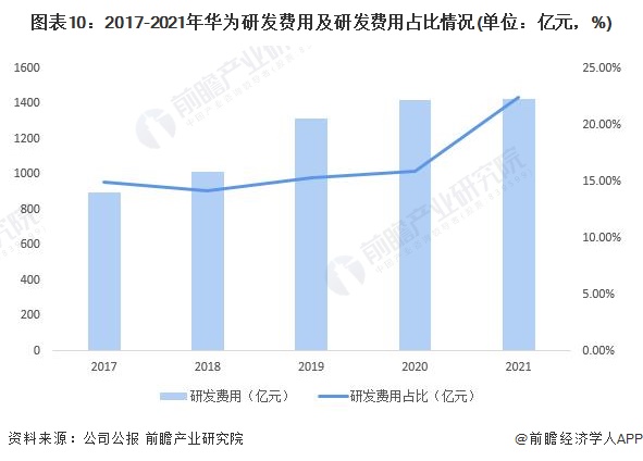 就研发投入来看,2017-2021年,华为的研发费用和研发费用和研发费用占比均呈逐年递增趋势变化,2021年华为研发费用达1426.66亿元,同比增长0.5%,研发费用占比高达22.4%。截至2021年末,华为的研发投入在全球企业中排名第二,近十年华为累计投入的研发费用超过8450亿元。