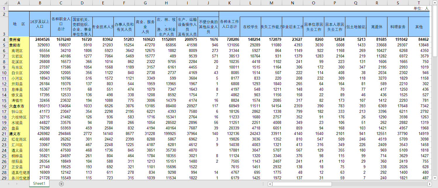 15岁及以上人口 | 各种职业人口 | 国家机关、党群组织、 | 专业技术人员 | 办事人员和有关人员 | 商业、服务业人员 | 农林牧渔水利业 | 生产、运输设备操作 | 不便分类的其他 | 各种未工作人口 | 在校学生 | 料理家务 | 离退休 | 丧失劳动能力 | 从未工作 | 失去工作 | 其他 |