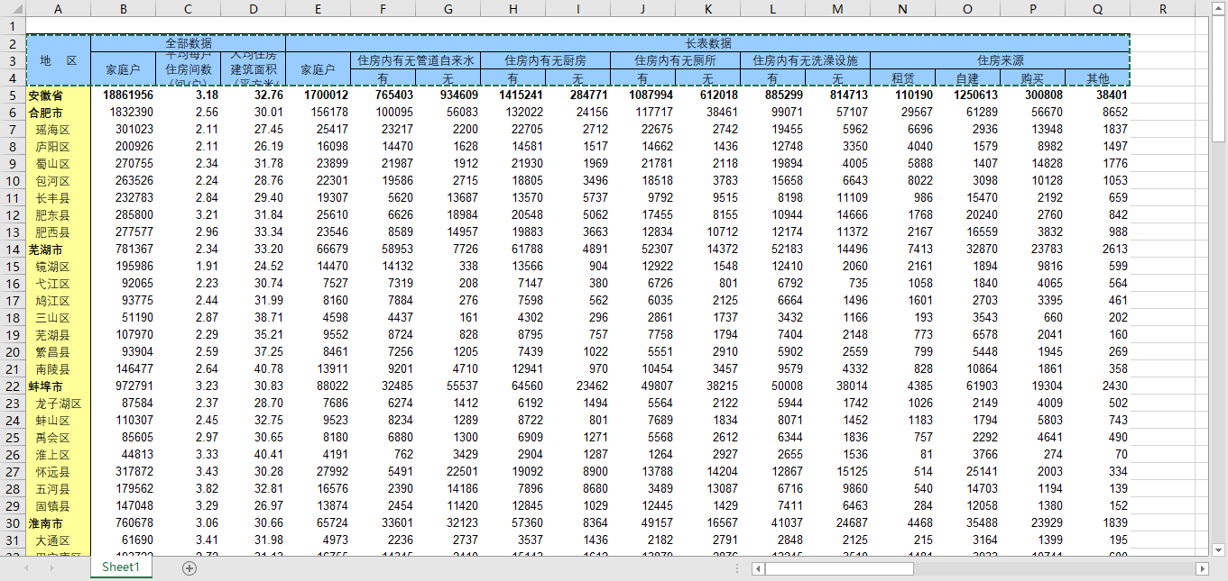 (平方米/人) | 家庭户 | 住房内有无管道自来水 | 住房内有无厨房 | 住房内有无厕所 | 住房内有无洗澡设施 | 住房来源 |