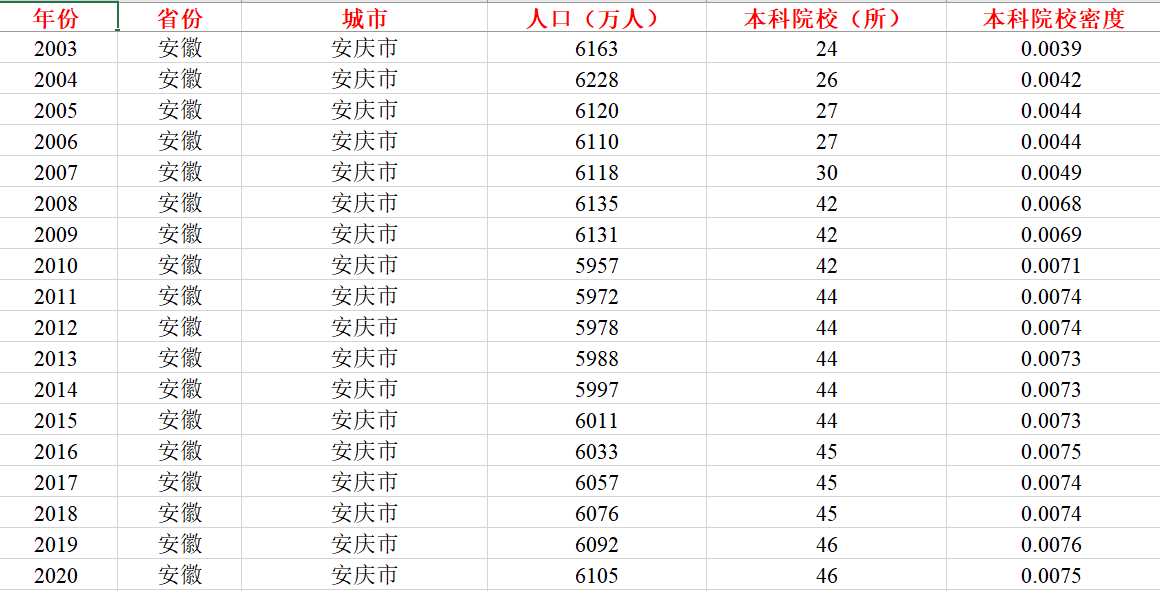 2003-2020年各城市本科院校密度数据,样本时间新,数据量大,基本可以满足毕业论文写作和科研需求。数据真实可靠,辛苦整理所得,分享给大家,希望对论坛各位同学毕业论文以及论文发表有所帮助。分享这份数据一是为了贴补家用,二是为了共享知识,希望诚心需要的同学下载使用,使用过程中如有任何疑问,可以加q2961096086交流心得。衷心祝愿论坛各位同仁毕业和发文顺利!整理的非常完整,十分规范,排版也很漂亮,节省您大量收集与整理时间,绝对物有所值!