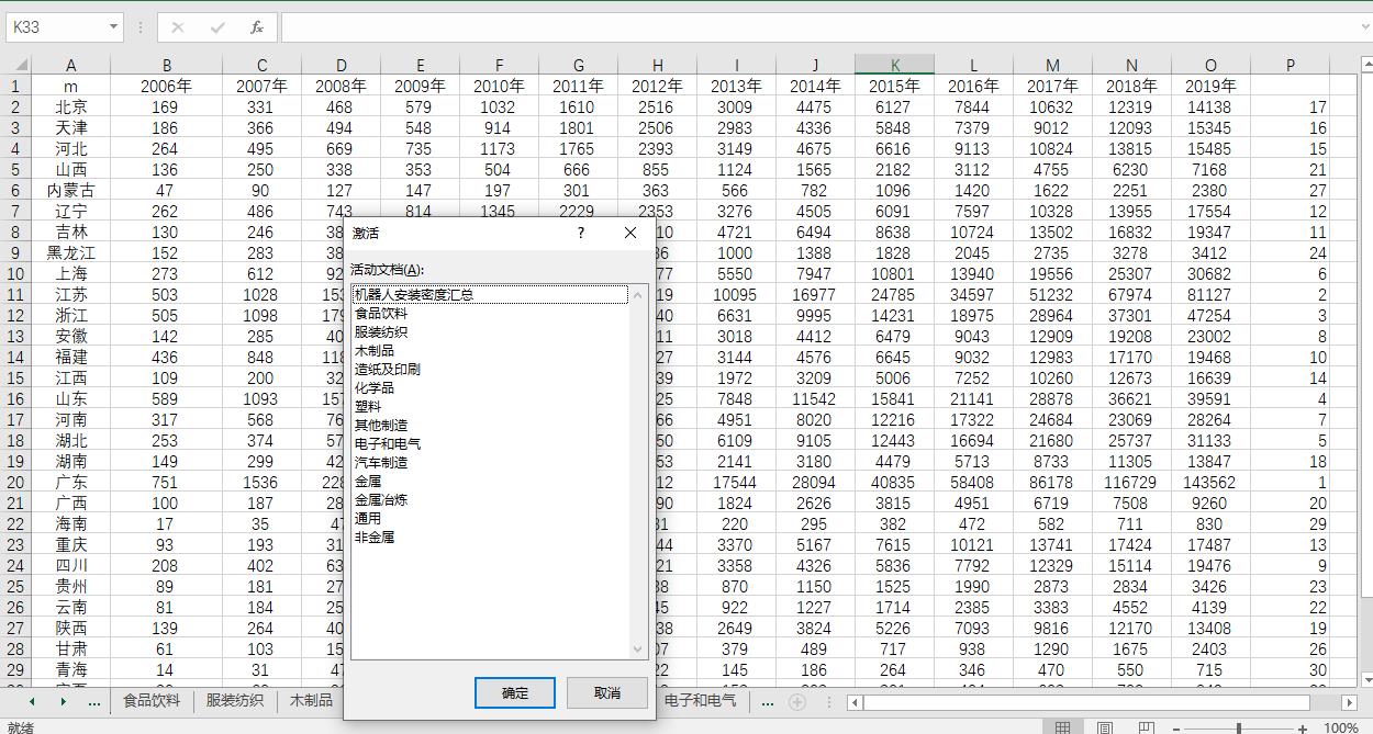 全国31省各省份机器人安装密度原始数据+测算结果2006-2019食品饮料服装纺织造纸印刷塑料化学汽车制造金属冶炼