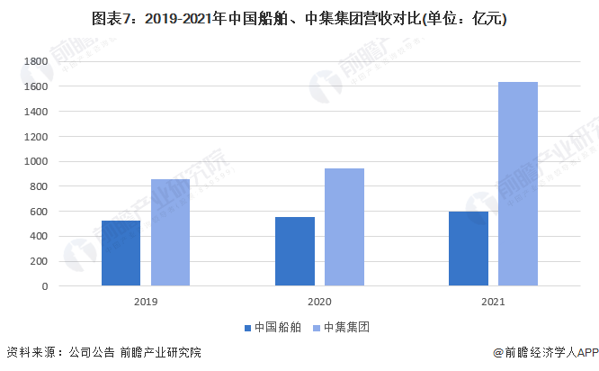 2019-2021年中国船舶和中集集团的营收均不断上升,2021年分别达到597亿元和1637亿元。中集集团在总营收方面,较中国船舶更胜一筹。