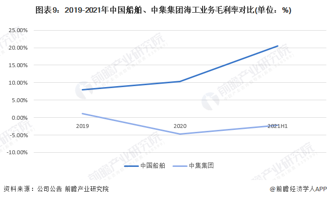从海工业务毛利率看,中国船舶2019-2021年上半年均为正值且呈现上升趋势,2021年达到20.53%。而中集集团海工业务毛利率率处于较低水平,2020年和2021年上半年甚至为负值。