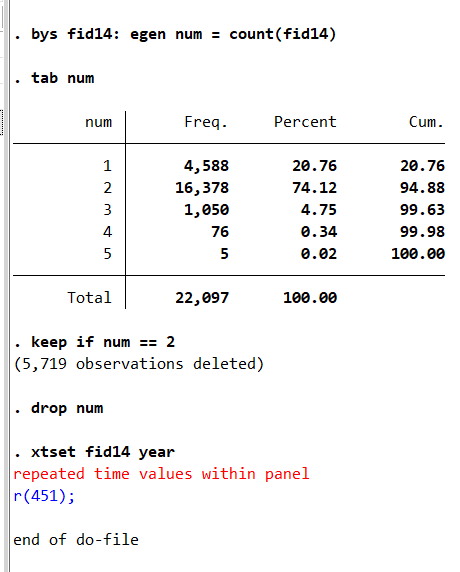 CFPS处理了14 16 18三年的数据.第一步先把16年的合并到14年,合并完用xtset fid14 year命令,出现repeated time values within panel,后来用bys fid14: egen num = count(fid14)等,操作下来,还是出现repeated time values within panel,具体的原因想不太明白,希望能指点一下。三年数据合并依旧如此