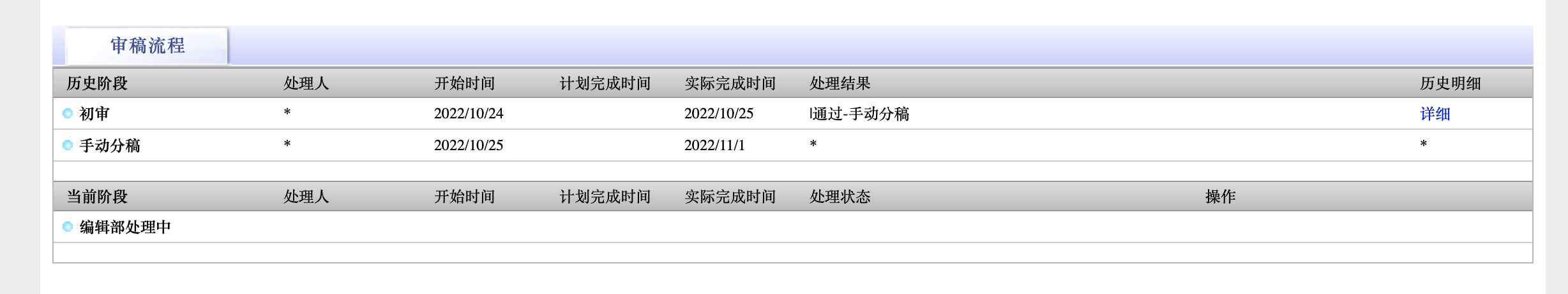 PHDkaikai 发表于 2022-11-9 10:07 审稿流程图如下10.24投稿。10.25手动分稿,11.1开始编辑部处理中