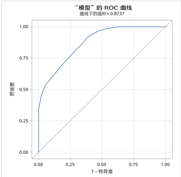 ROC曲线也是基于灵敏度和特异度来进行判断的。曲线下面积AUC指的是ROC曲线、底线和右侧线围成的面积。ROC曲线的面积一般在0.5-1之间。这个数值越接近1,表明模型预测能力越强。当AUC在0.7-0.9时,我们认为模型有较高的判断作用。而AUC接近0.5的时候,我们人为这个模型是无效的