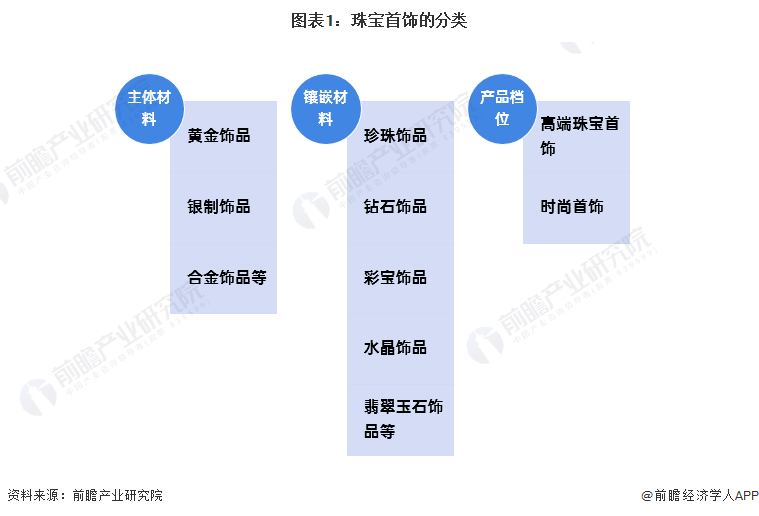 珠宝首饰可根据首饰的主体材料、镶嵌材料和产品档位进行分类。按主体材料可分为黄金首饰、银制首饰、合金首饰等;按镶嵌材料分则可分为珍珠首饰、钻石首饰、彩宝首饰、水晶首饰、翡翠玉石首饰等;按照产品档位分则可分为高端珠宝首饰、时尚首饰。