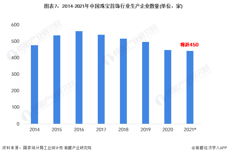 根据《中国工业统计年鉴》的数据,截至2020年,中国规模以上珠宝首饰及相关物品制造行业企业数量为将近450家。根据初步统计计算,2021年,中国规模以上珠宝首饰及相关物品制造行业企业数量与2020年相差无几。