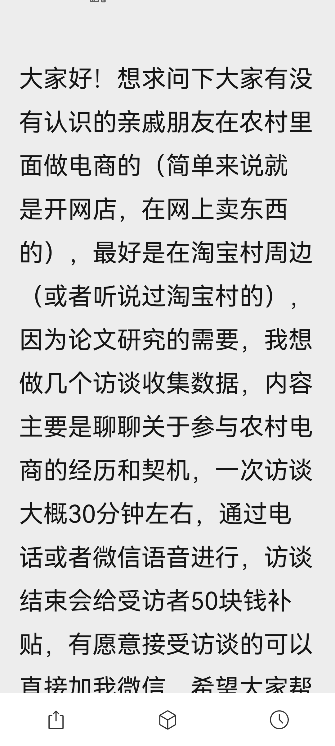 大家有没有认识的做农村电商的亲戚朋友,一次访谈50,要求如下图,有认识的求推荐,救救孩子吧