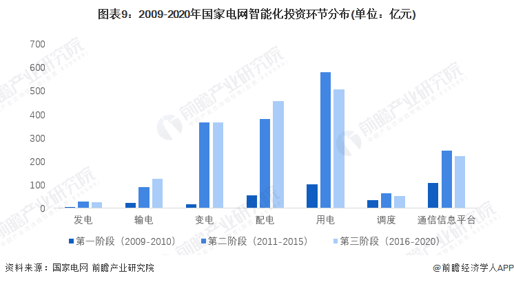 根据《国家电网智能化规划总报告》,智能电网的重点在用电、配电、变电及通信环节。整体来看用电环节投资规模最大,三个阶段投资额分别达到101亿元、579亿元和505亿元,其次是配电环节和变电环节。在第三阶段,国家电网持续加大输电、变电和配电环节的智能化投资规模。