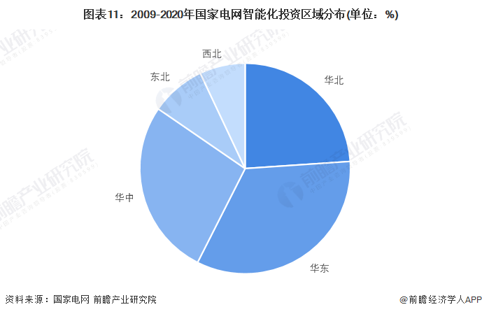 从各地区电网智能化投资额来看,华东、华中、华北区域的智能化投资占电网总投资的比例较高,三个地区的智能化投资合计占国家电网公司经营区域内智能化投资的80%以上。东北、西北的智能化投资分别为8.4%和7.0%。