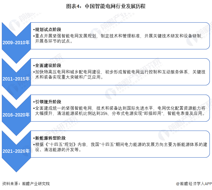 2009年,中国正式启动智能电网计划,自此我国智能电网建设拉开了序幕。根据规划,2009-2010年时我国智能电网的规划试点阶段;2011-2015年是我国智能电网的全面建设阶段;2016-2020年,是我国智能电网的引领提升阶段。