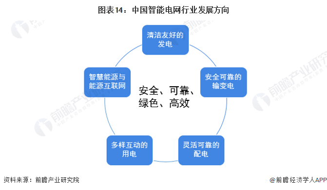 根据国家《关于促进智能电网发展的指导意见》、《关于推进“互联网+”智慧能源发展的指导意见》等指导文件,为实现“安全、可靠、绿色、高效”的总体目标,围绕智能电网发输配用全环节,我国智能电网行业未来发展方向包括五大重点,分别为清洁友好的发电、安全高效的输变电、灵活可靠的配电、多样互动的用电、智慧能源与能源互联网。